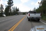 wyruszyliśmy w drogę do pierwszego punktu naszej dzisiejszej wycieczki – gejzera Old Faithful. Żeby uświadomić sobie ogrom powierzchni jaką zajmuje park Yellowstone zaznaczymy, że z kempingu wyjechaliśmy ok. 07.00 natomiast do gejzera dotarliśmy mniej więcej około godziny 8.30. Sporo czasu, biorąc nawet pod uwagę ograniczenia do 45m/h oraz dzikie zwierzęta na drodze: