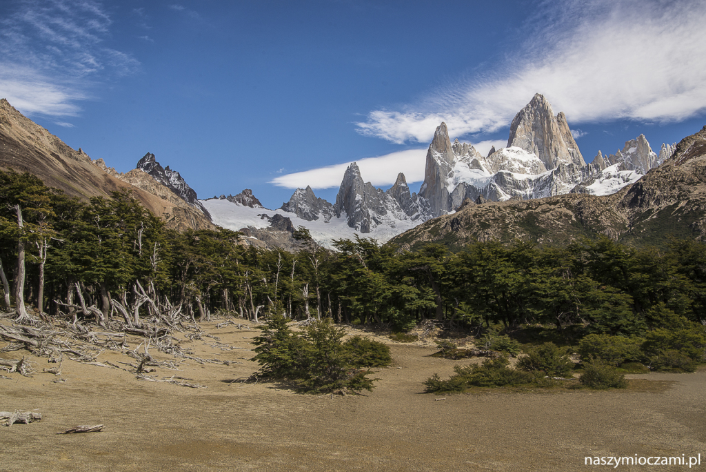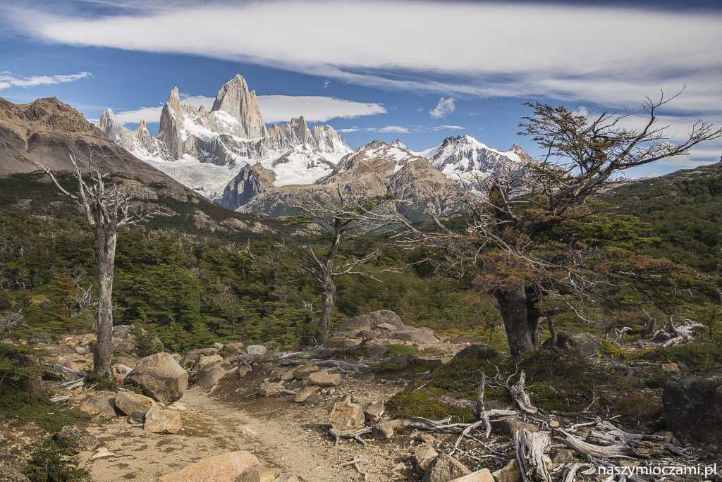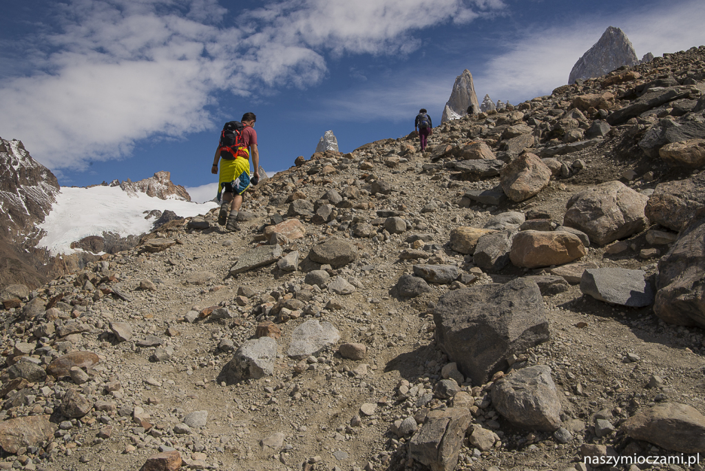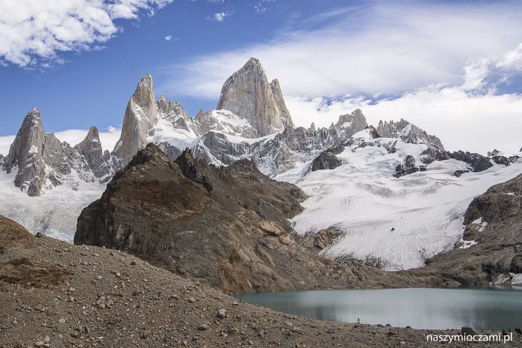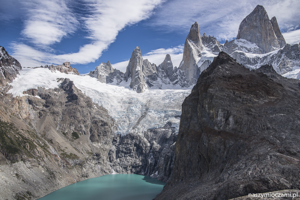 Najcięższą częścią treku była ostatnia godzina – podejście na punkt widokowy. Po mokrych kamieniach, a potem po drobno pokruszonych skałach pokonaliśmy około 600 metrów w pionie. Nie było lekko. Słońce sięgnęło zenitu. Paliło nas jak przez soczewkę. W końcu udało się. Dotarliśmy do punktu widokowego nad szmaragdową wodą, to była Laguna de Los Tres. Szczęki nam opadły. Zrobiliśmy kilka zdjęć. Ale wciąż było nam mało. Znowu ruszyliśmy w górę. Po kilkunastu minutach stanęliśmy twarzą w twarz z Fitz Royem, a u stop mieliśmy 2 jeziora: po lewej Sucia po prawej Los Tres. Jaki to był widok? Zobaczcie sami!