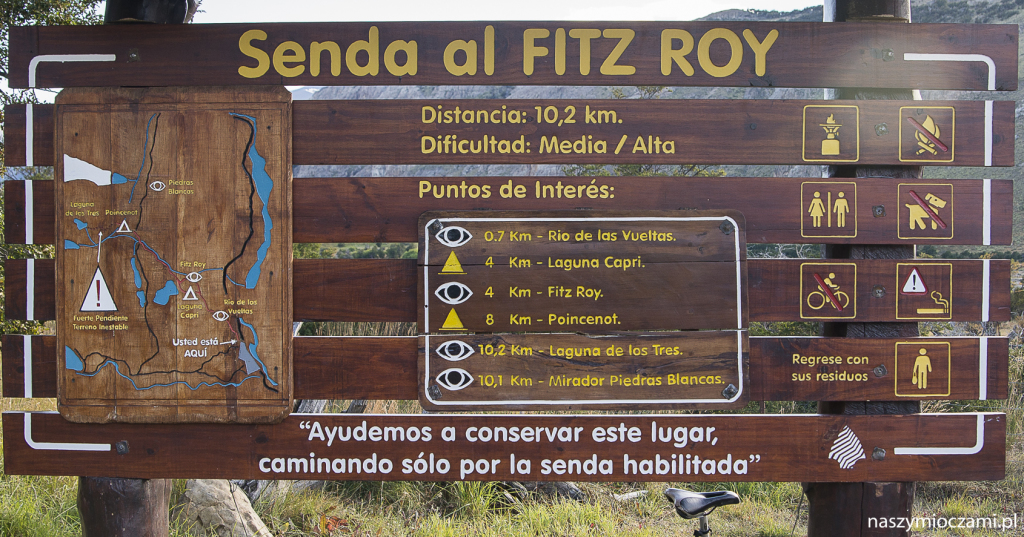 Podczas pobytu w Patagonii mieliśmy dużo aktywności górskich, jedną z nich była jednodniowa wędrówka pod Fitz Roy i z powrotem. Była to 10 godzinna wycieczka, podczas której pokonaliśmy nieco ponad 20 km trasy i około 1000 m w pionie. Marsz zaczęliśmy wcześnie rano z El Chalten, gdzie spędziliśmy poprzednią noc i zostawiliśmy duże plecaki. Natomiast do małych plecaków spakowaliśmy najpotrzebniejsze rzeczy (aparaty, windstopery, kilka kanapek, orzechy i butelki z wodą) i wzięliśmy je ze sobą. Szlak przecina kilka strumieni, w których płynie orzeźwiająca woda prosto z lodowca, w których na bieżąco uzupełnialiśmy zapasy płynów :) Przed przyjazdem do Patagonii nie zdawaliśmy sobie sprawy, że woda z lodowca jest taka smaczna!