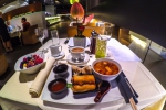 Z prawej strony od wejścia mamy olbrzymi bar, gdzie możemy posmakować niespotkanej przeze mnie do tej pory ilości alkoholi. Dalej jest część restauracyjna, gdzie możemy zamówić dania z karty lub skorzystać z bufetu. Ja postawiłem na azjatyckie śniadanie (spring rollsy, pierożki dim sum i zupa miso), które smakowało wybornie. Do tego polecam soki z wyciskanych owoców i warzyw (największą popularnością cieszył się napój marchewkowy). Ciekawą sprawą jest także wielka maszyna do krojenia szynki parmeńskiej, która jest tutaj świeża i bardzo smaczna. Jeżeli wolimy coś słodkiego to oczywiście mamy tutaj do wyboru najróżniejsze ciasta, tarty i inne smakołyki. Mi do gustu przypadły cukierki podobne do Ferrero Rocher i Rafaello.