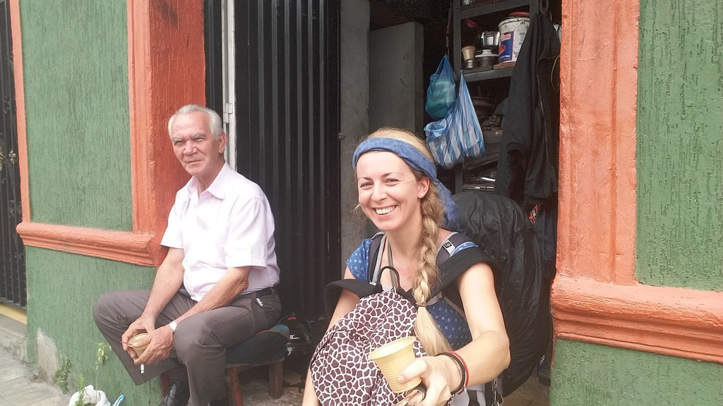 W weekend na głównym placu w Salento otwiera się kilkanaście małych barów, knajpek, są stragany z jedzeniem, Kolumbijczycy tańczą salsę. Ja na szlaku poznałam szarmackiego Bena, który trzymał drut kolczasty żebym mogła pooglądać z bliska cielaczka. Ben i aguardiente to złe połączenie.